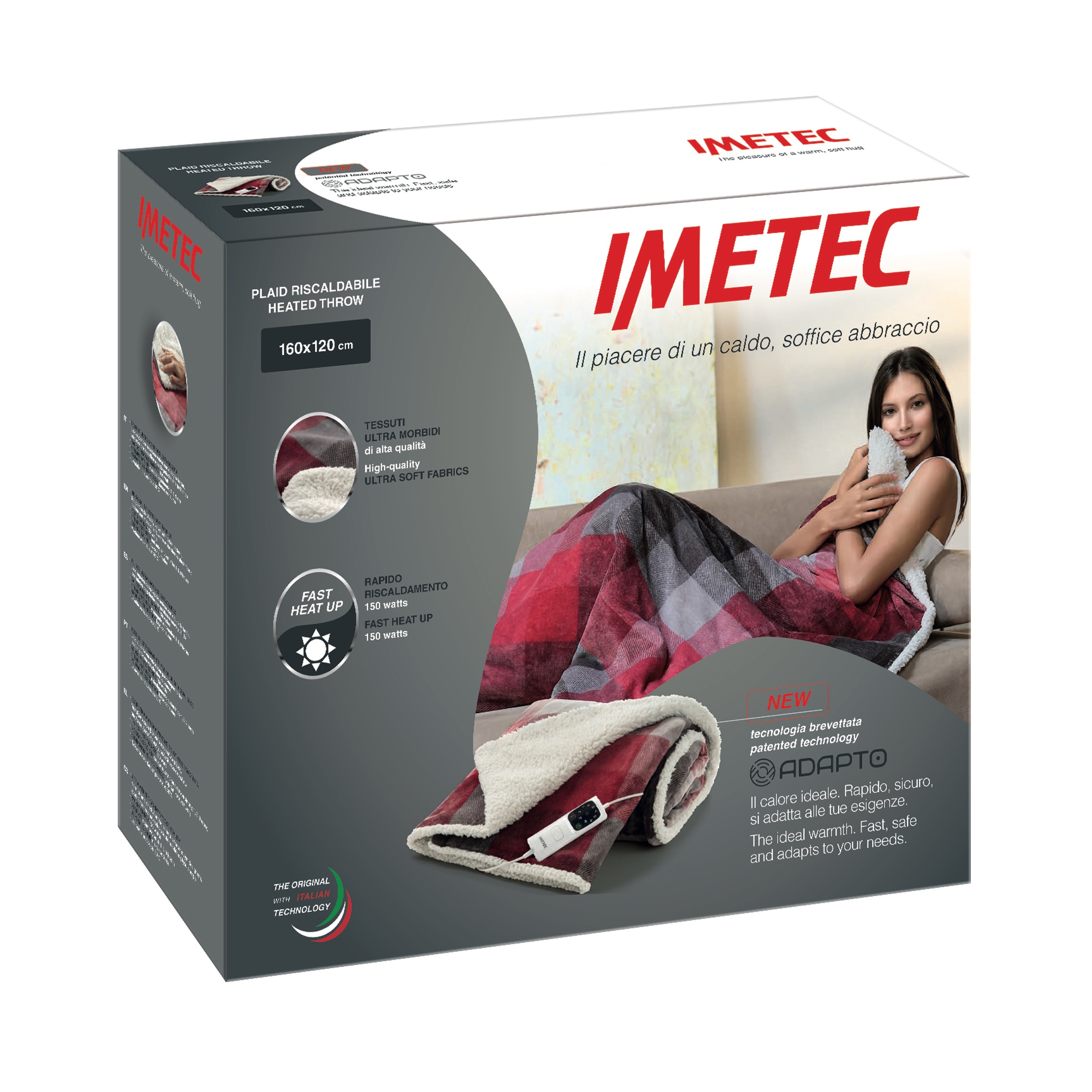 IL PIACERE DI UN CALDO ABBRACCIOLa tecnologia brevettata Adapto® assicura velocità di riscaldamento, controllo costante della temperatura 25 volte al secondo e la massima sicurezza. Raggiunto il livello di calore desiderato, riduce la potenza e regola e mantiene costante la temperatura in base a quella del corpo e dell’ambiente, per un comfort insuperabile. Dispone di 6 temperature e si spegne da solo programmando il timer dopo 1-3-9 ore. La sicurezza è garantita dall’esclusivo sistema di controllo digitale Electro Block® con funzione di auto-diagnosi ad ogni accensione.Lato superiore in setoso velvet con disegno tartan, lato inferiore in soffice e caldo peluche sherpa bianco.Dimensione 160x120 cmTecnologia brevettata ADAPTO ® : Il calore ideale. Rapido, sicuro, si adatta alle tue esigenze. Assicura velocità di riscaldamento, controllo costante della temperatura 25 volte al secondo e la massima sicurezza. Grazie a un software avanzato e ad un innovativo sistema di controllo digitale, sfrutta tutta la sua potenza per riscaldarsi velocemente. Durante l’uso si adatta costantemente alla temperatura naturale del corpo e dell’ambiente circostante, garantendo il calore ideale per un riposo rigenerante.Riscaldamento rapido, 150 wattTessuto superiore vellutato e setoso con disegno tartan, tessuto inferiore in soffice e caldo peluche sherpa bianco: una morbidezza unica che amplifica il piacere del suo caldo abbraccio.Sistema di sicurezza Electro Block® con avanzato controllo elettronico Effettua ad ogni accensione un controllo automatico del corretto funzionamento del prodotto e lo monitora costantemente durante l’uso notturno.1 comando separabile, 6 temperature per scegliere il calore desiderato Timer di autospegnimento dopo 1, 3 o 9 oreRisparmio energetico: basso consumo Comando separabile per permettere il lavaggio Lavabile a 30;C in lavatrice Dimensione 160x120 cm